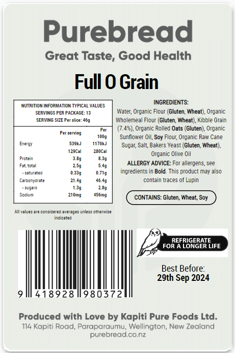 Ingredients: Certified Organic Wholemeal and White flour, Organic Rolled Oats, Organic Raw Cane sugar, Organic Kibbled Wheat, and Organic Soy Flour, Eco-Living Filtered Water, Organic Sunflower Oil, Olive Oil, Certified Sea Salt and Fresh Yeast.