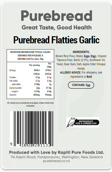 Ingredients: Organic Brown Rice Flour, Organic Tapioca Flour, Organic Raw Cane Sugar, Organic Sunflower Oil, Guar Gum, Fresh Yeast, Organic Cider Vinegar, Certified Sea Salt, Organic Eggs, Filtered Living Water, NZ Organic Garlic.