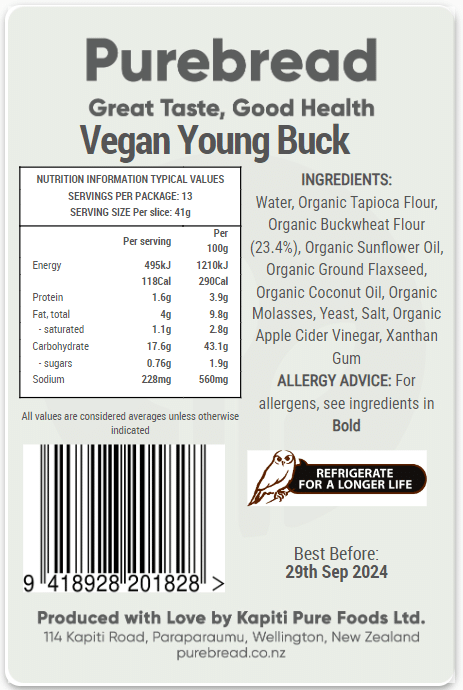 Ingredients: Fresh Yeast, Organic Buckwheat, Organic Tapioca Starch, Organic Linseed, Organic Sunflower Oil, Organic Coconut Oil, Organic Molasses, Organic Cider Vinegar, Certified Sea Salt, Xanthan Gum, Filtered Living Water.